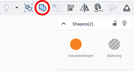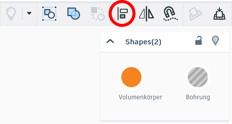 Klicke auf die drei im nächsten Bild markierten schwarzen Kreise. Dadurch zentrierst du die beiden Zylinder und sorgst dafür, dass ein Boden unter der Bohrung entsteht.
