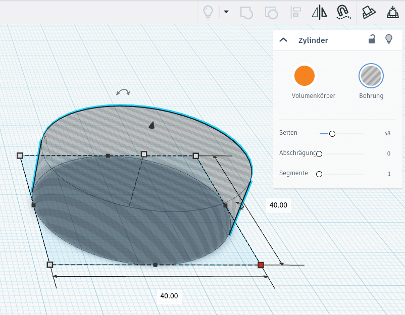 Erstelle einen Zylinder mit einem Durchmesser von 40 mm und einer Höhe von 12 mm.