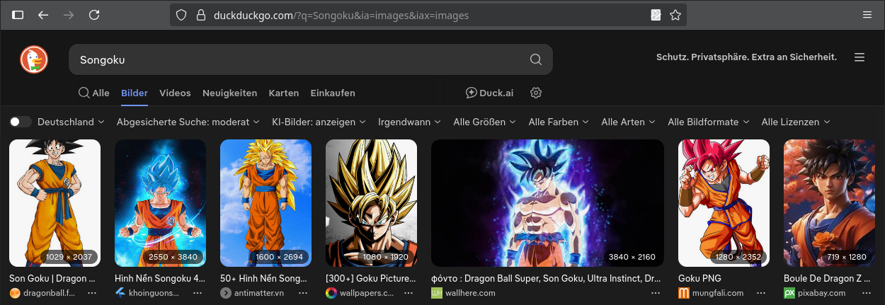 Suche im Internet z. B. bei https://duckduckgo.com/ nach passenden Bildern für eine Lithophanie. Gebe dazu einen passenden Suchbegriff ein, z. B. „Songoku“ und drücke Enter. Danach kannst du oben auf „Bilder“ klicken, um passende Bilder anzuzeigen.