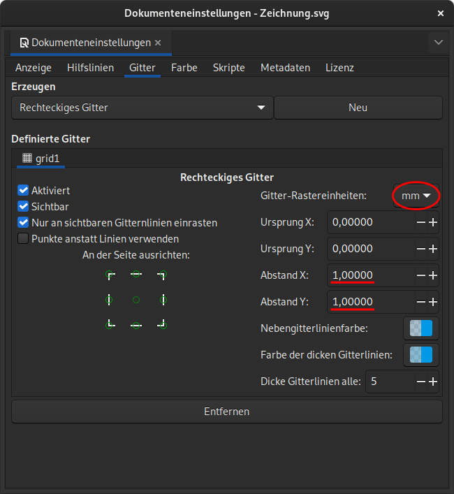 Wähle den Menüpunkt Datei → Dokumenteinstellungen… und prüfe, ob das Raster richtig eingestellt ist. Die Rasterlinien sollen in X- und Y-Richtung einen Abstand von 1 mm haben, so wie im folgenden Bild: