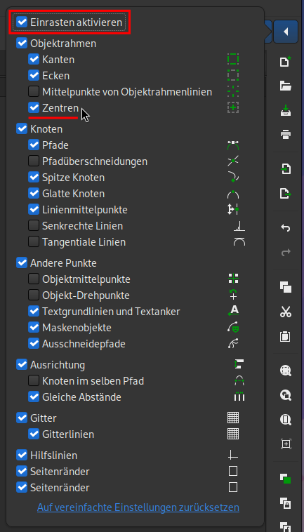 Damit wir den Kreis leichter ausrichten können, aktivieren wir das automatische Einrasten des Mittelpunkts. Klicke dazu in der Symbolleiste am rechten Rand ganz oben auf den Pfeil, klicke dann auf Fortgeschritten und aktiviere das Einrasten und den Punkt Zentren: