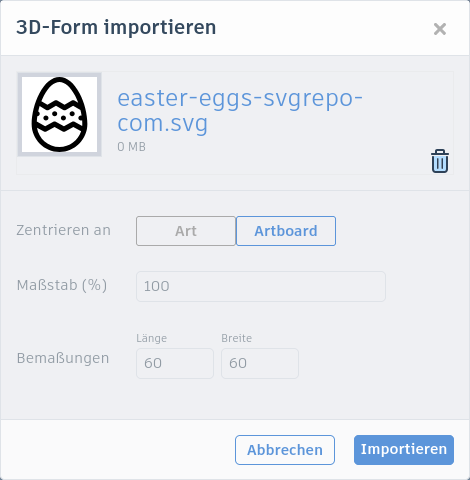 Öffne Tinkercad und erstelle einen neuen 3D-Entwurf. Importiere die SVG-Datei. Setze im folgenden Fenster bei der Bemaßung den größeren der beiden Werte (also die Länge oder die Breite) auf 60. Oft sind beide Werte gleich.