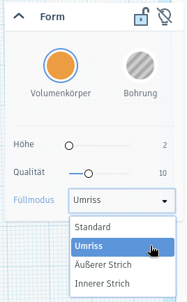 Wähle das importierte Objekt aus und klicke oben rechts auf Umriss. Setze die Höhe auf 2 mm.